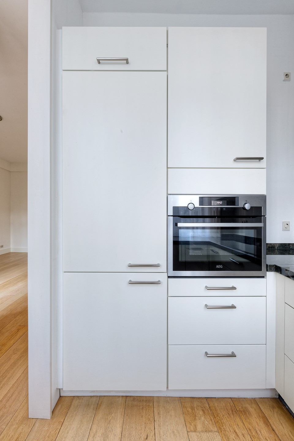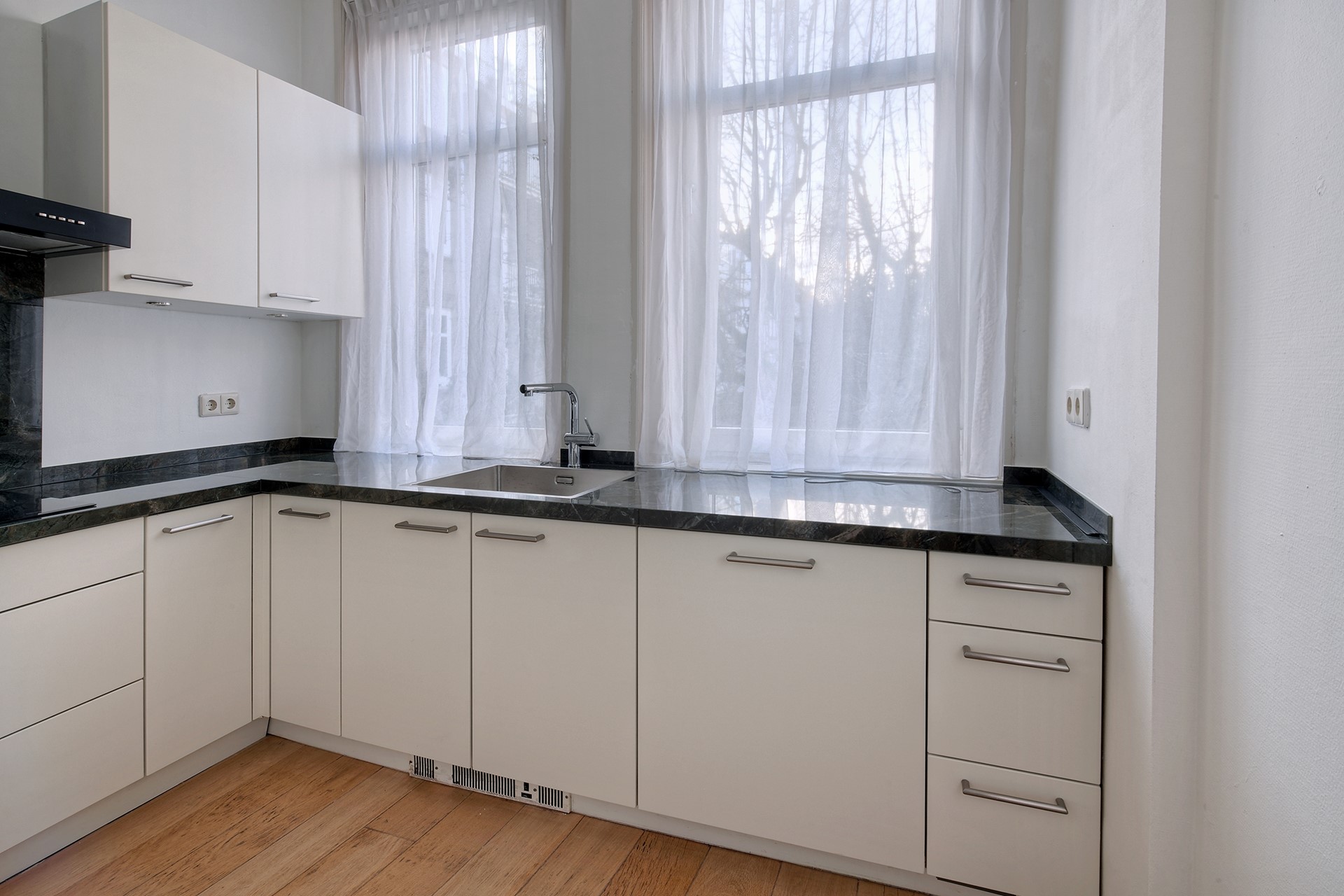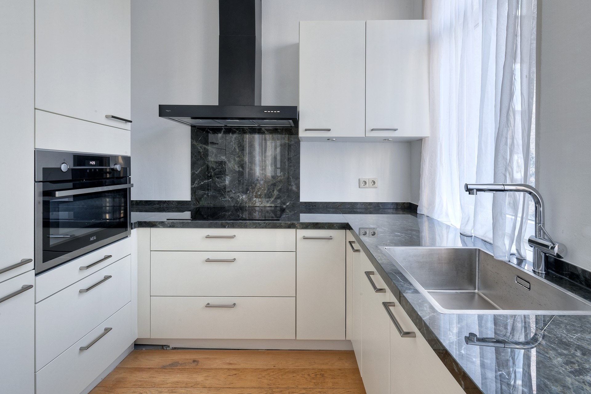 De keuken is strak vormgegeven, is licht door de vele ramen en voorzien van alle nodige inbouwapparatuur zoals een vriezer, koelkast, combimagnetron, vaatwasser, inductie kookplaat en een afzuigkap. De keuken is evenals de rest van de woning voorzien van een lamel parket vloer. Het werkblad is recentelijk vervangen voor een prachtig keramisch werkblad in een diep groene marmerlook.
