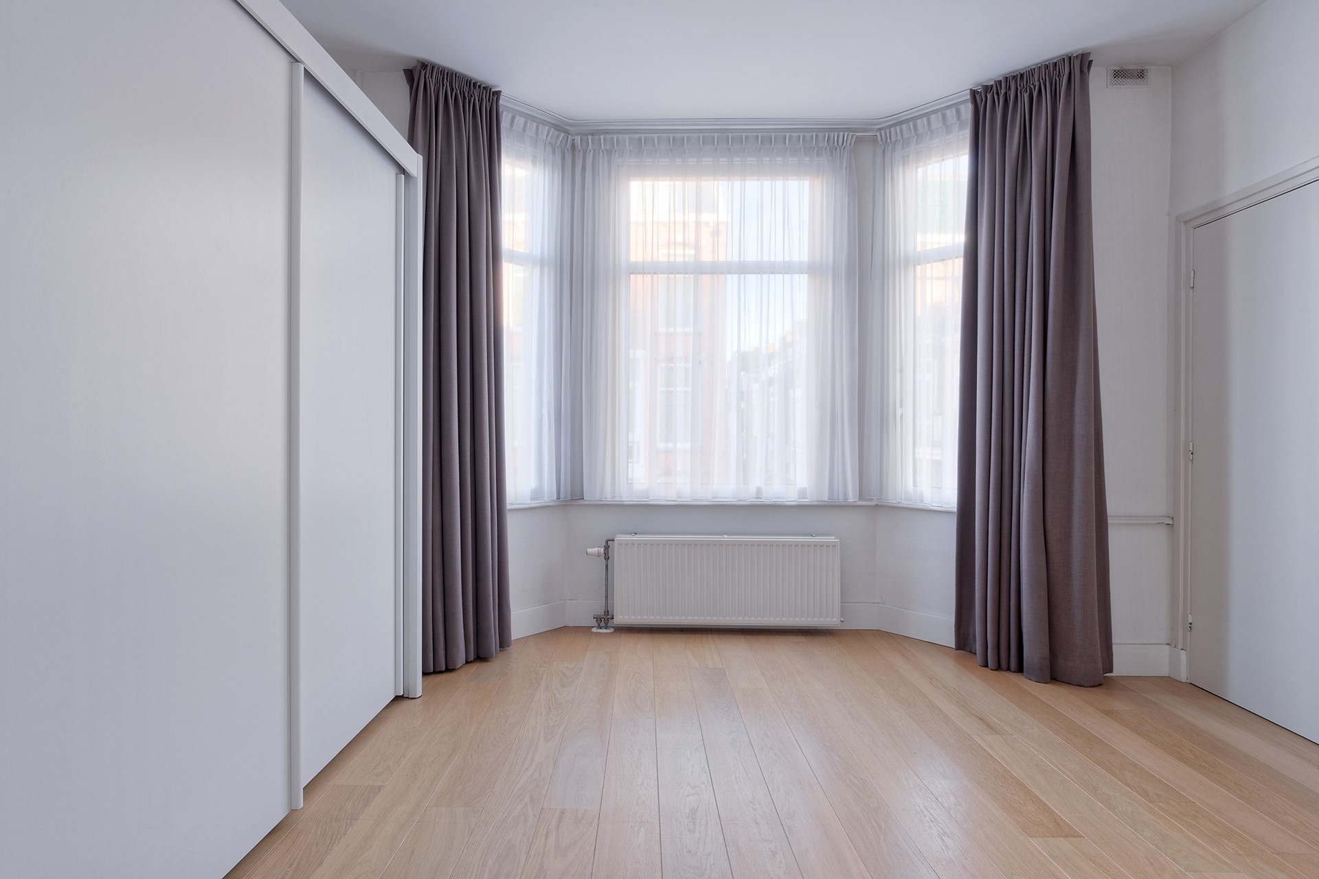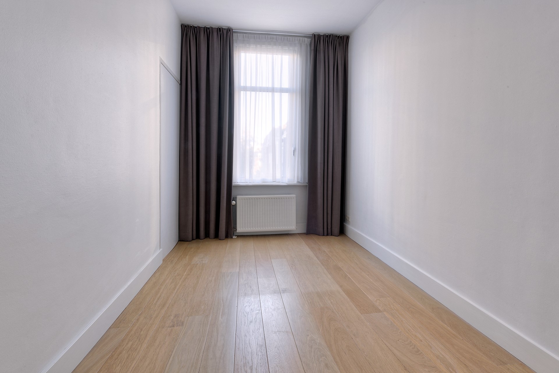 Achter de badkamer, dus aan de voorzijde van de woning, treft u de eerste slaapkamer aan van circa 16 m². Deze kamer is voorzien van grote ramen met erker. Aan deze kamer grenst de tweede slaapkamer van circa 12 m².
