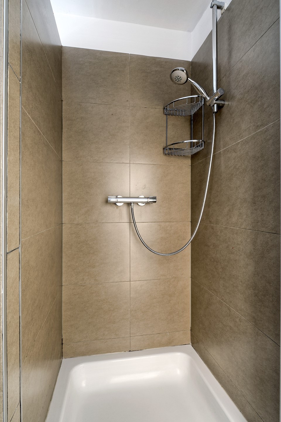 De slaapkamer ligt aan de rustige achterzijde en biedt voldoende plek voor een tweepersoonsbed en kastruimte. Aangrenzend bevindt zich de badkamer, voorzien van zowel een ligbad als een separate douche — een fijne luxe in het stadsleven.
