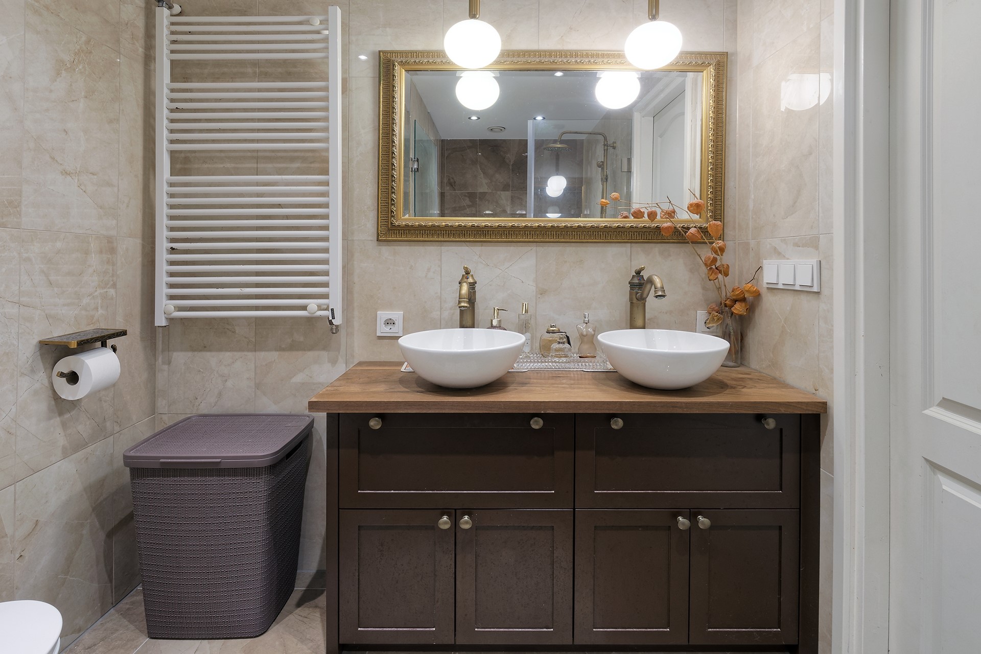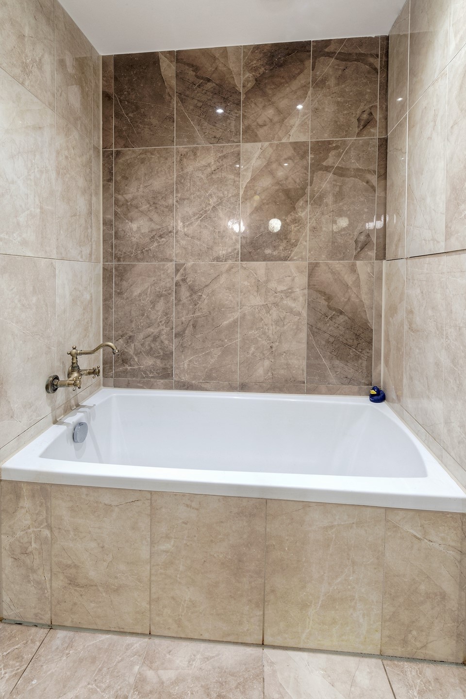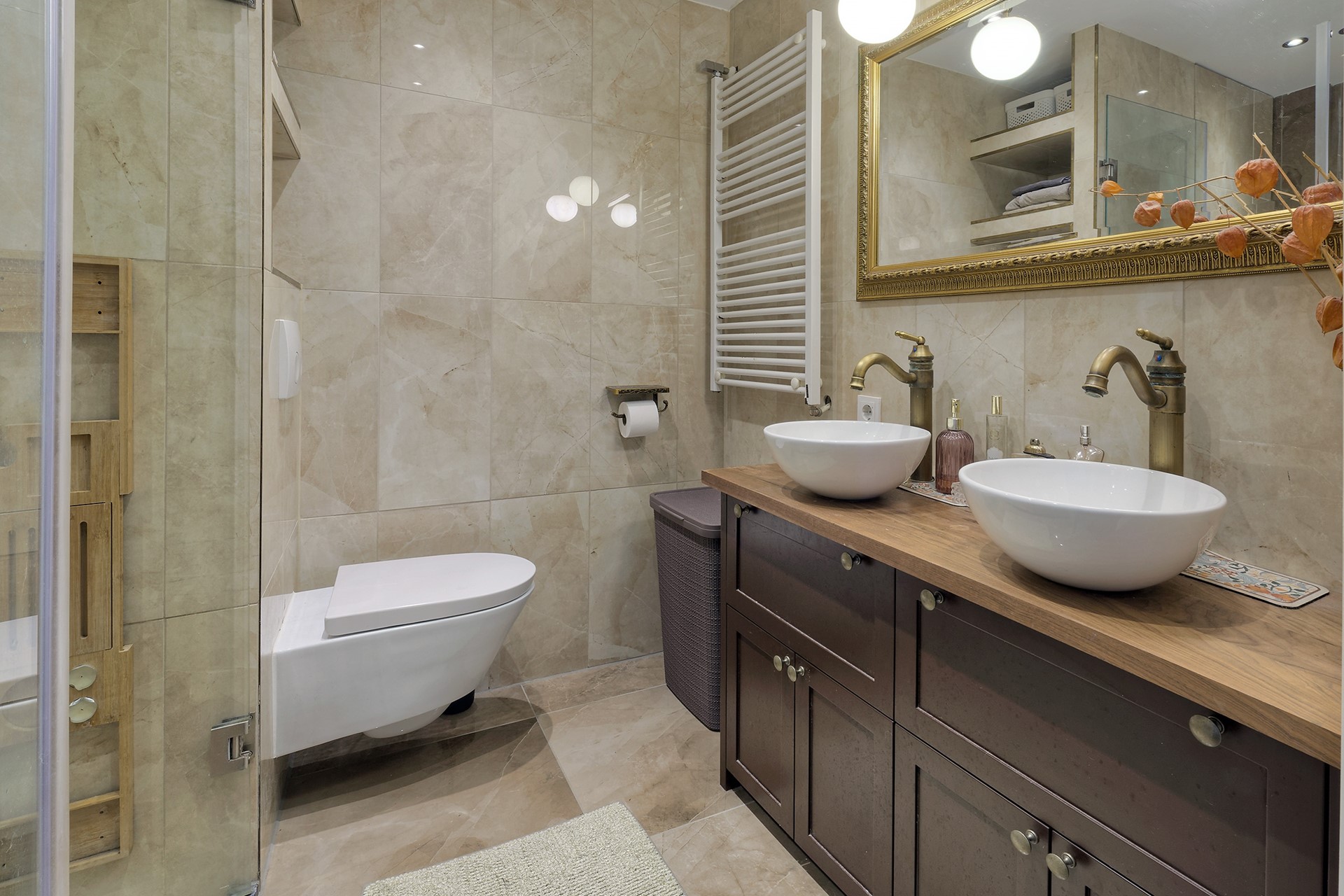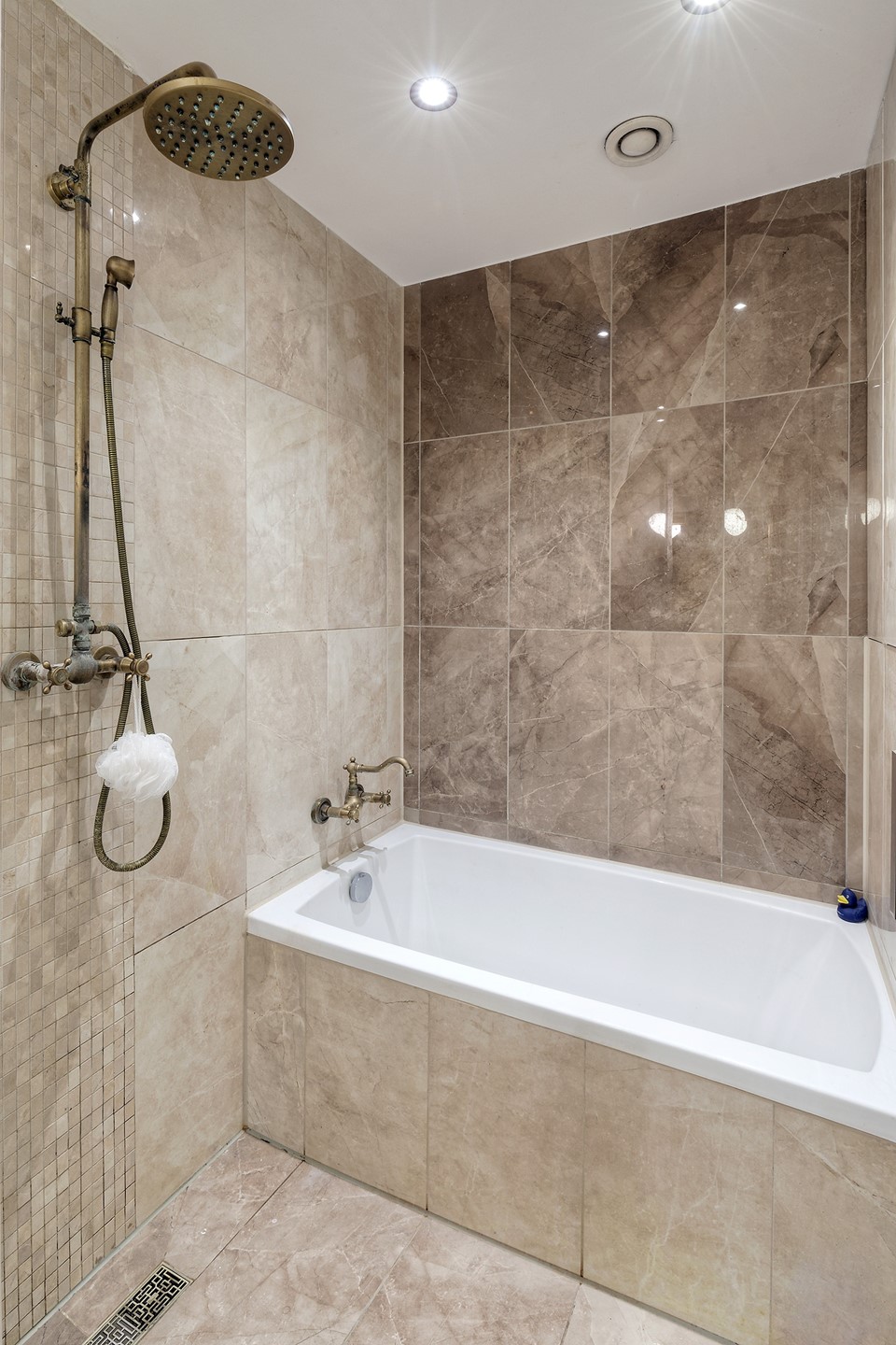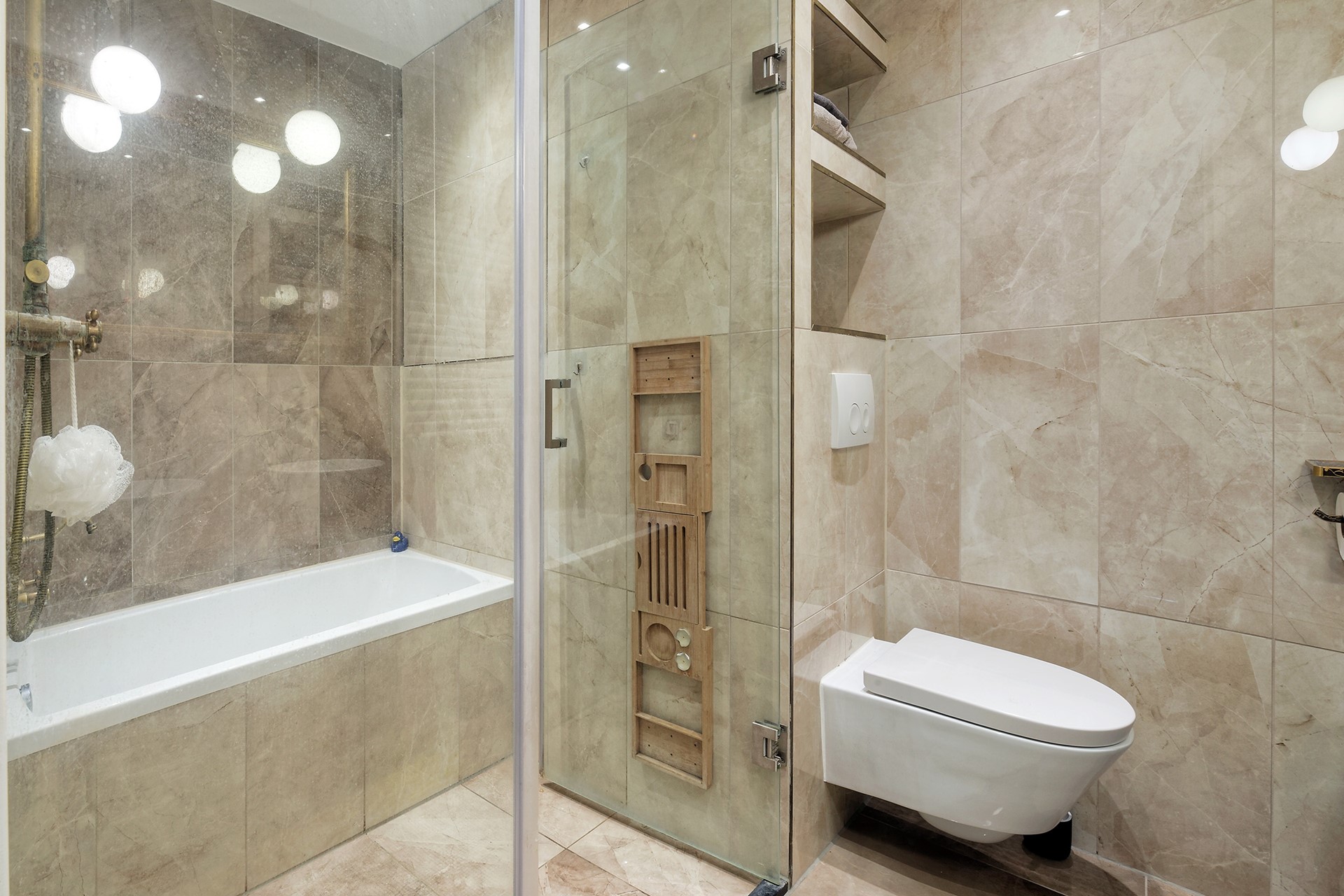 De badkamer is recent smaakvol verbouwd (2020) en uitgevoerd in een luxe marmerlook. Hier vind je zowel een inloopdouche als een ligbad, en een elegant wastafelmeubel met dubbele waskommen. De toiletruimte is eveneens in de badkamer geïntegreerd, wat een moderne en praktische indeling geeft.