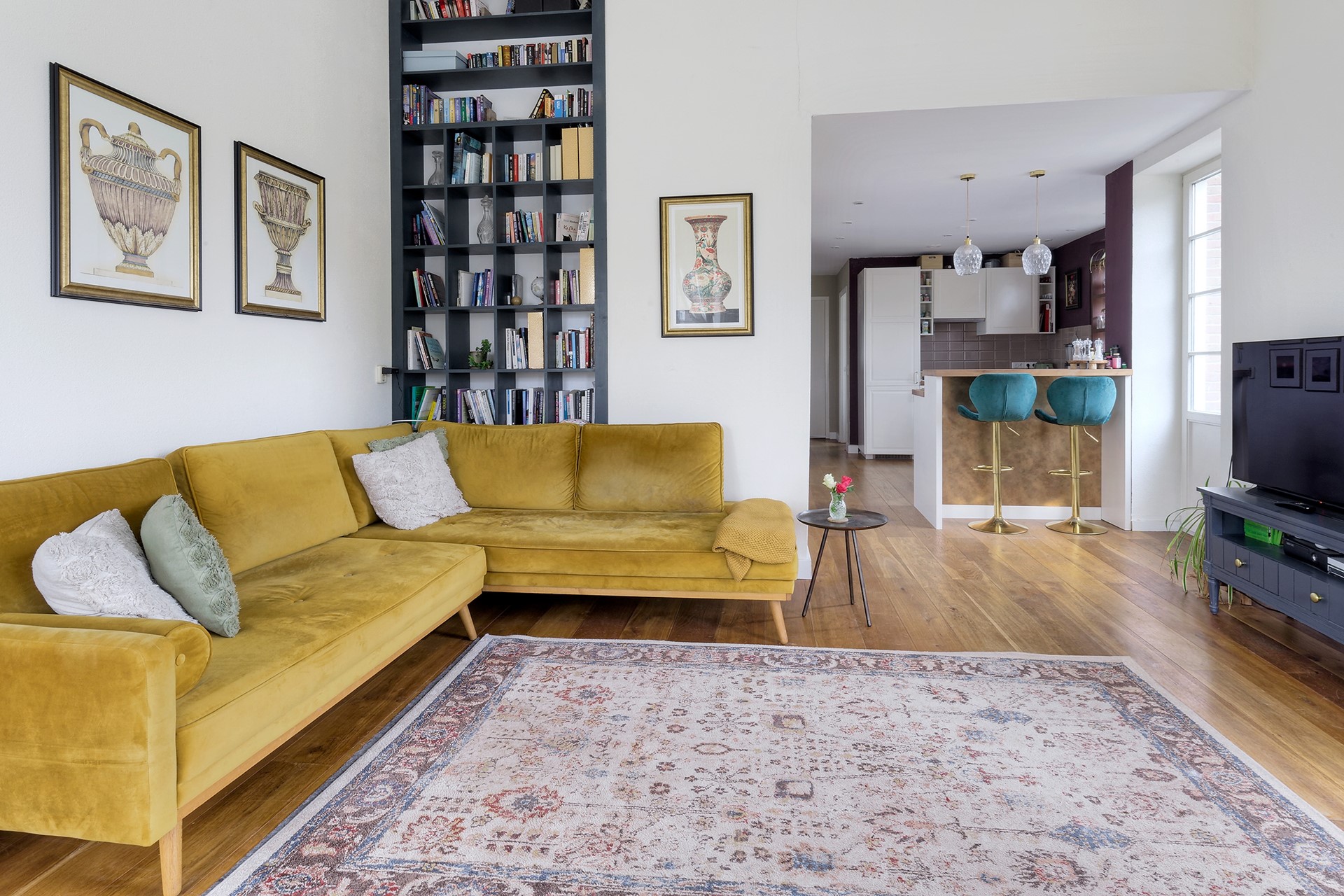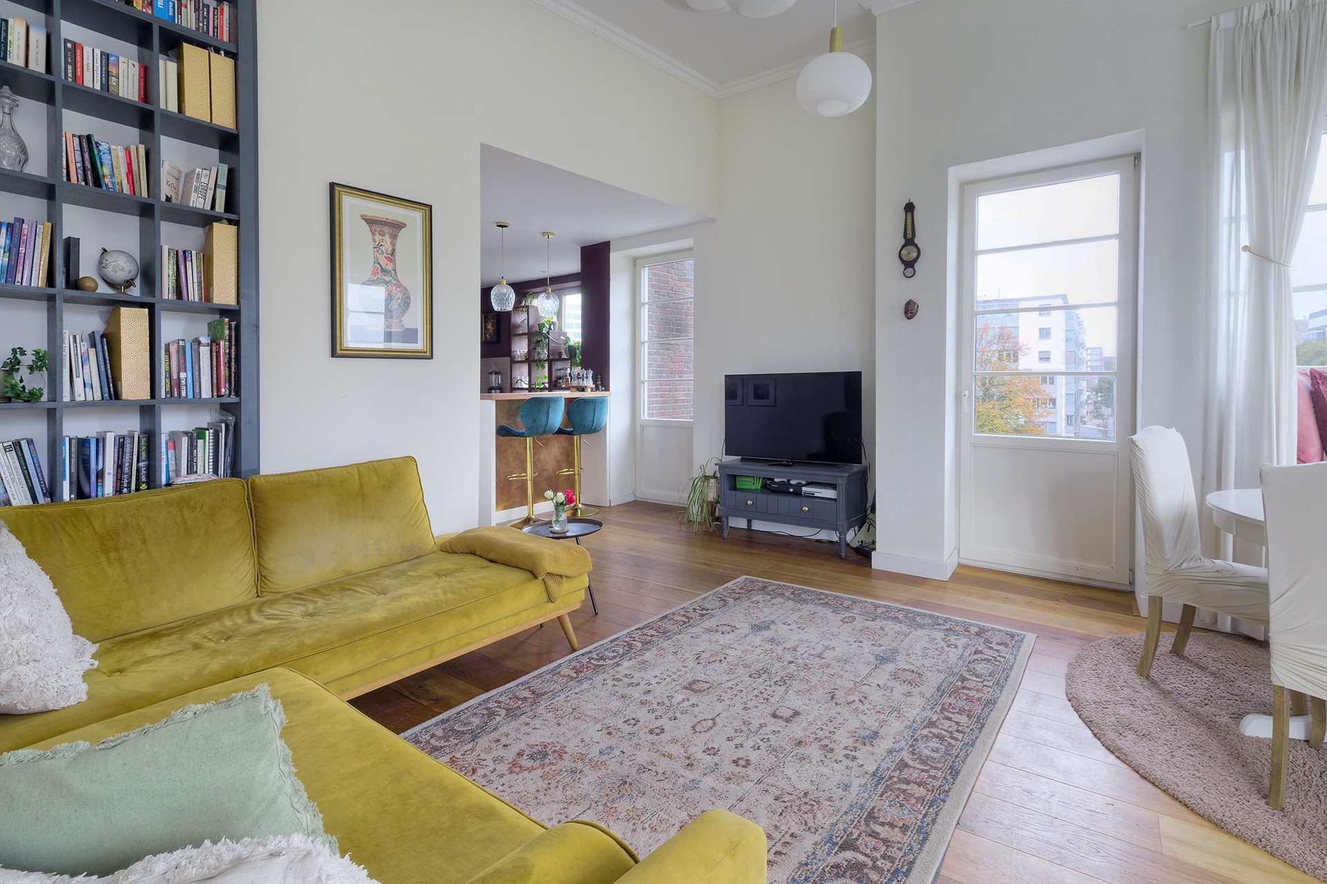 Bij binnenkomst valt direct de prachtige lichtinval en de royale hoogte op: de woonkamer heeft een plafond van maar liefst 3,7 meter hoog, wat zorgt voor een ruimtelijk gevoel en een bijzondere sfeer. De op maat gemaakte boekenkast tot aan het plafond benadrukt deze hoogte en geeft het interieur een verfijnde uitstraling.