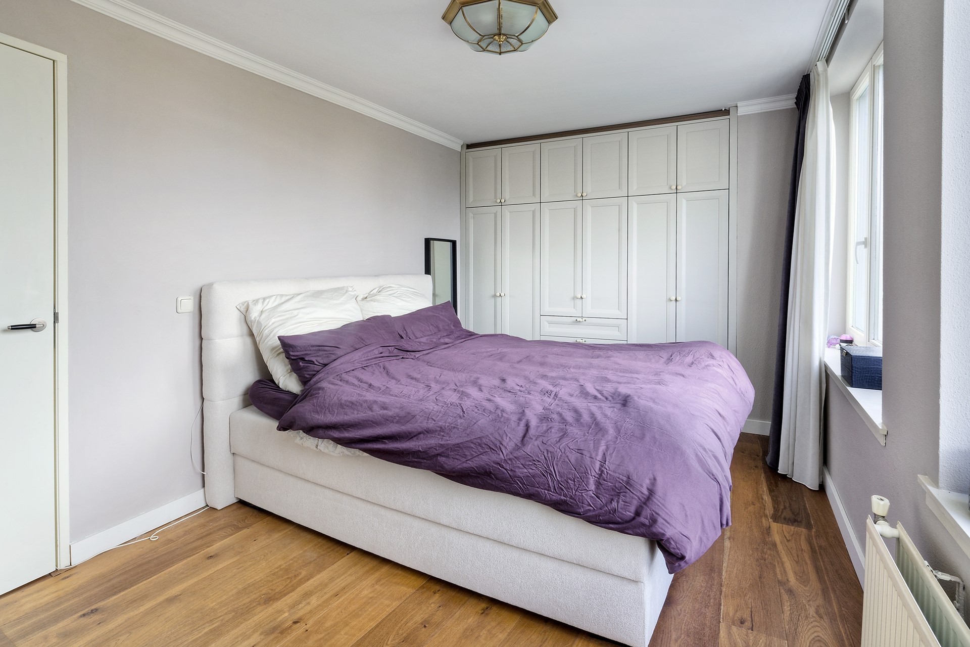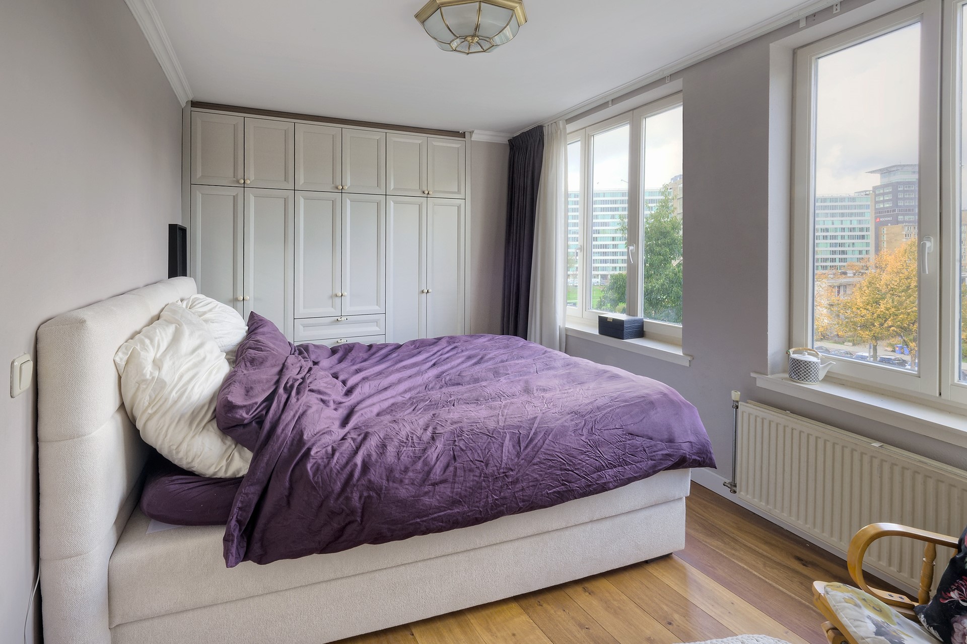 Het appartement beschikt over twee royale slaapkamers. De hoofdslaapkamer is voorzien van op maat gemaakte inbouwkasten, wat zorgt voor volop bergruimte en een strak geheel. De tweede slaapkamer wordt momenteel gebruikt als werkkamer, maar is uiteraard ook zeer geschikt als logeer- of kinderkamer.