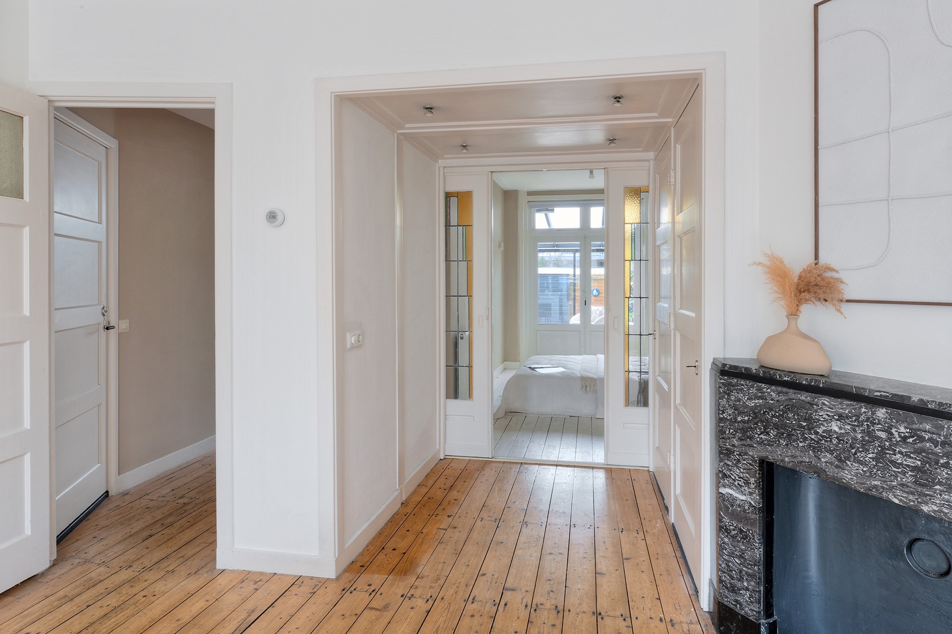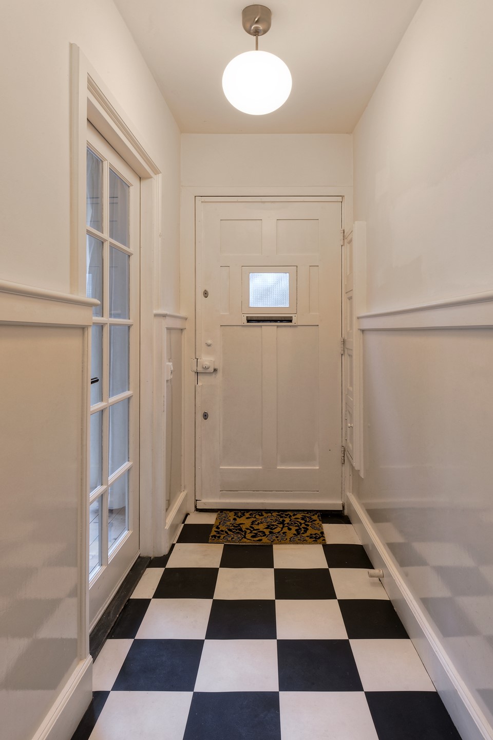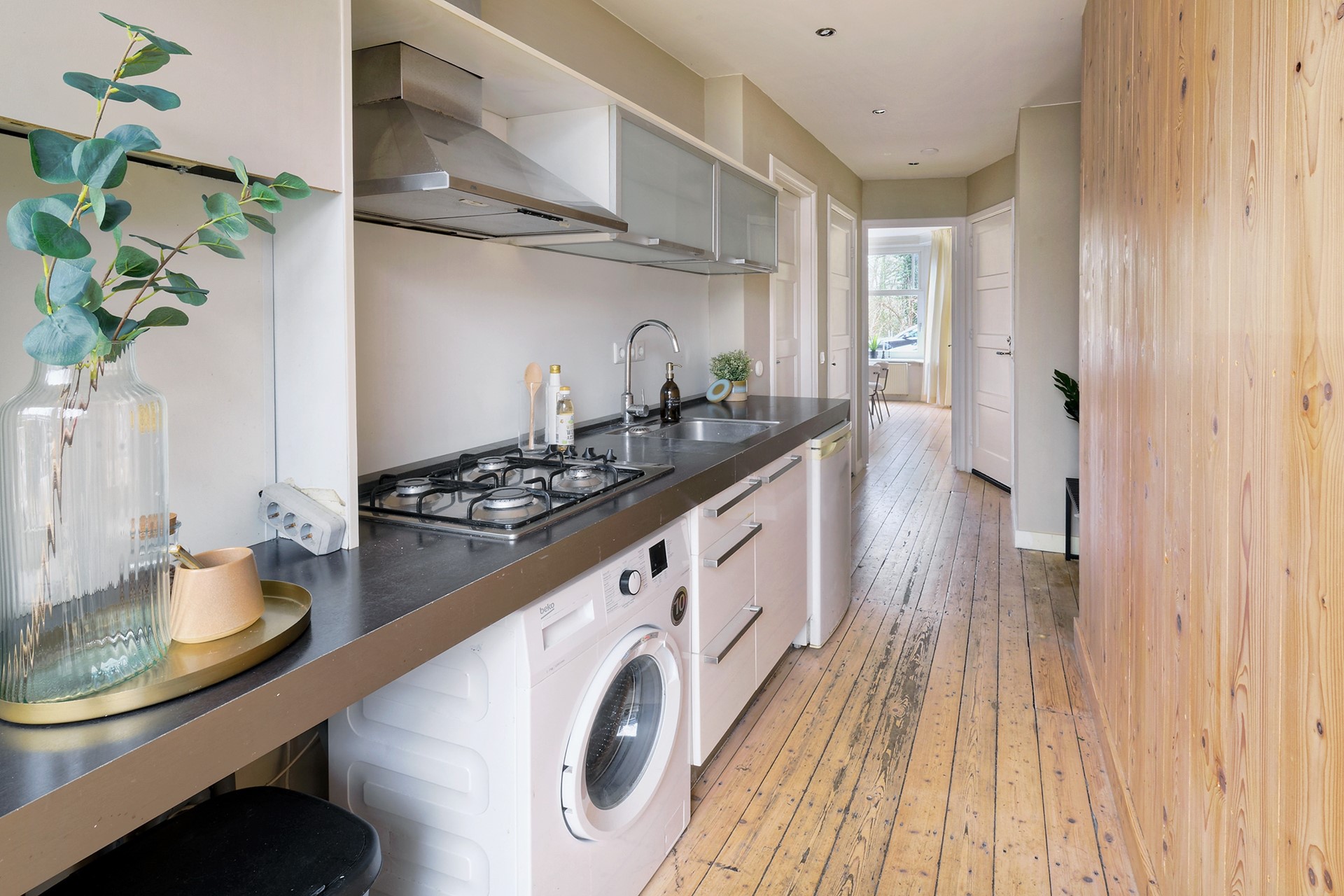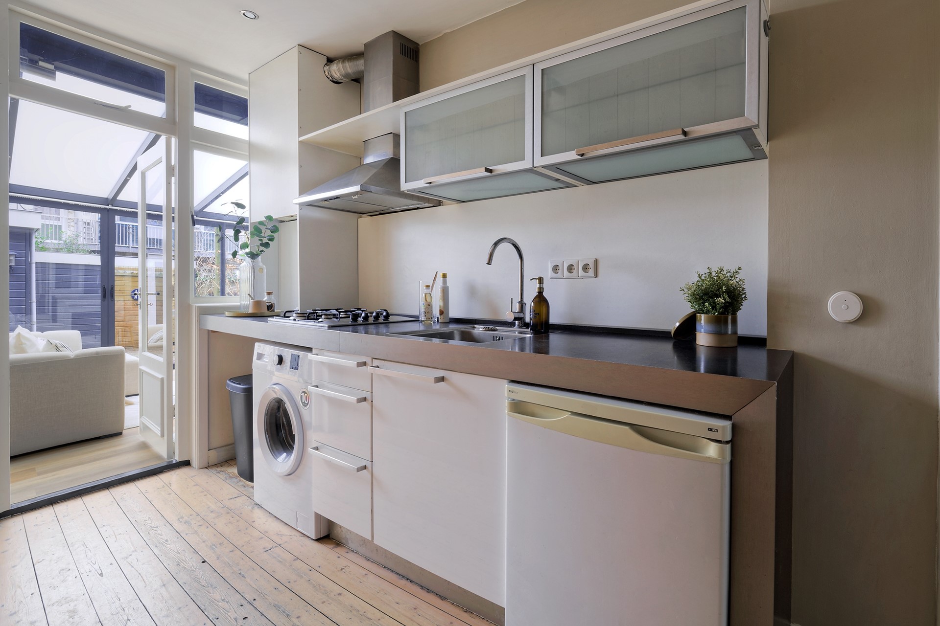 De ruime hal vormt geeft toegang tot de badkamer en de keuken. Vanuit de keuken bereikt u zowel de tuinkamer als de tweede slaapkamer, waardoor deze woning ook zeer geschikt is voor gezinnen, werken aan huis of logés.
