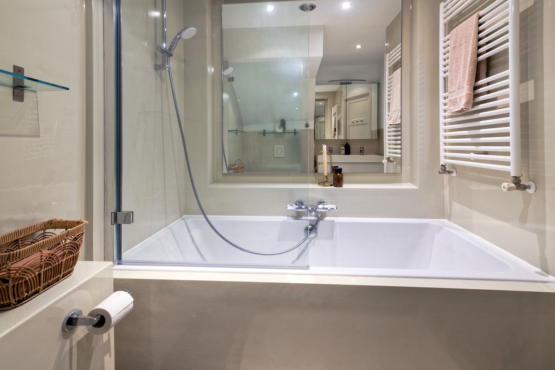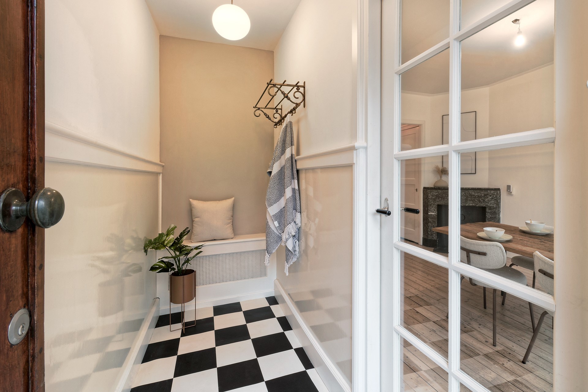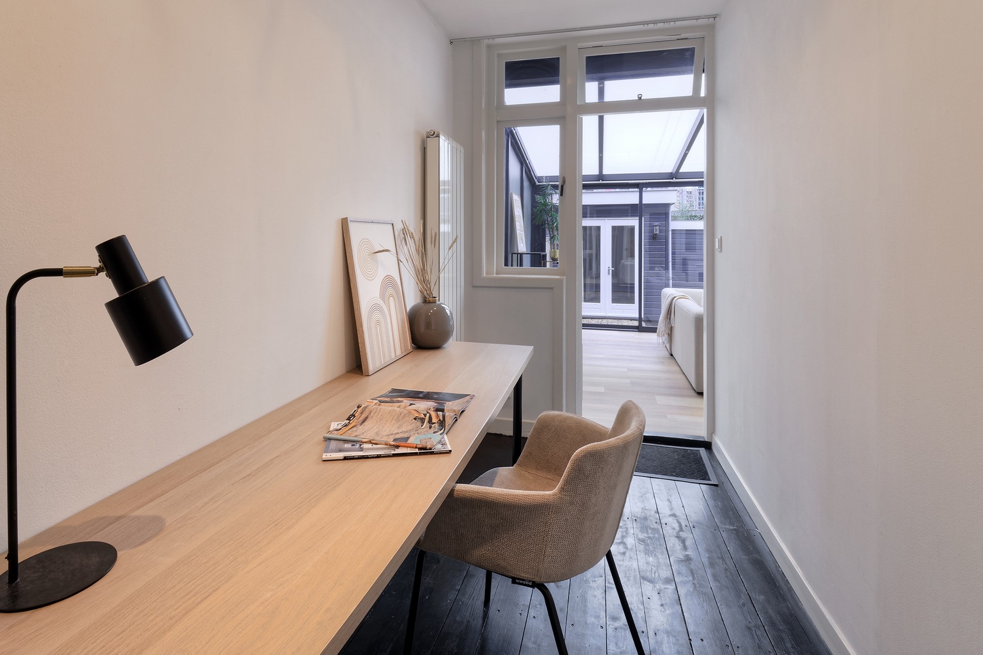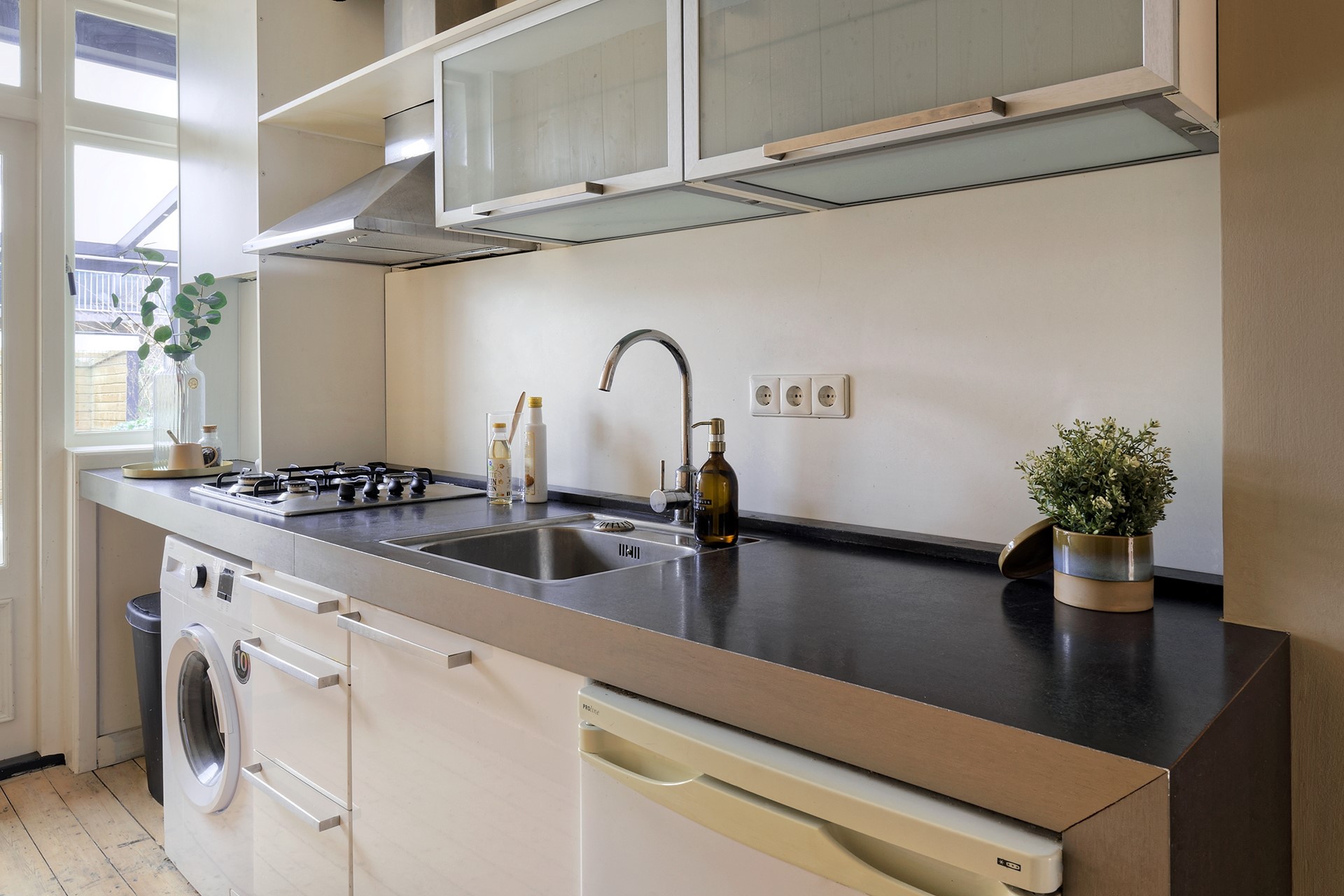 De ruime hal vormt geeft toegang tot de badkamer en de keuken. Vanuit de keuken bereikt u zowel de tuinkamer als de tweede slaapkamer, waardoor deze woning ook zeer geschikt is voor gezinnen, werken aan huis of logés.