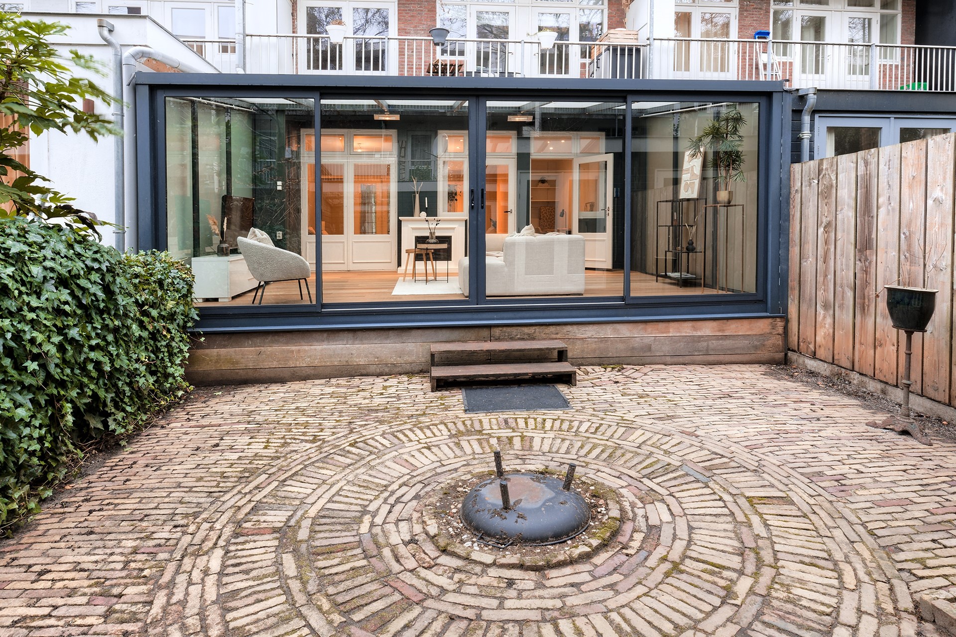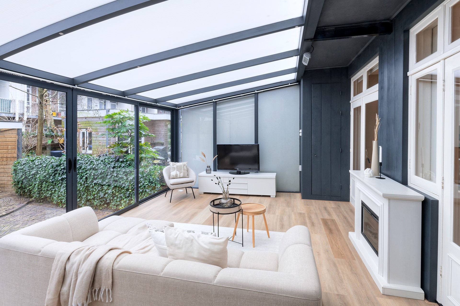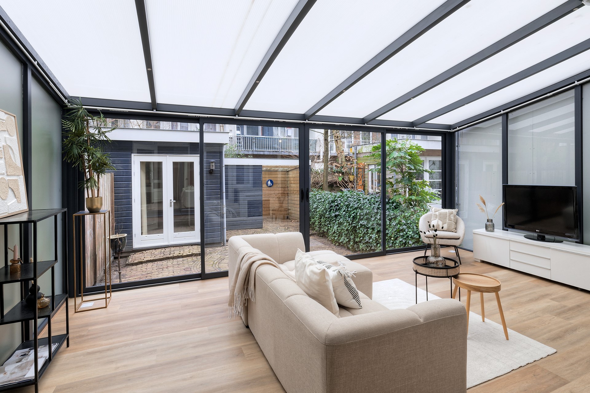 De serre is uitgevoerd met aluminium puien en een schuifpui naar de verzorgde achtertuin. Hier vindt u volop privacy, groen en een praktische fietsenstalling.