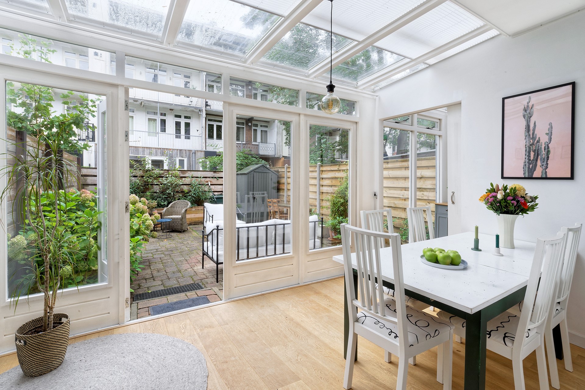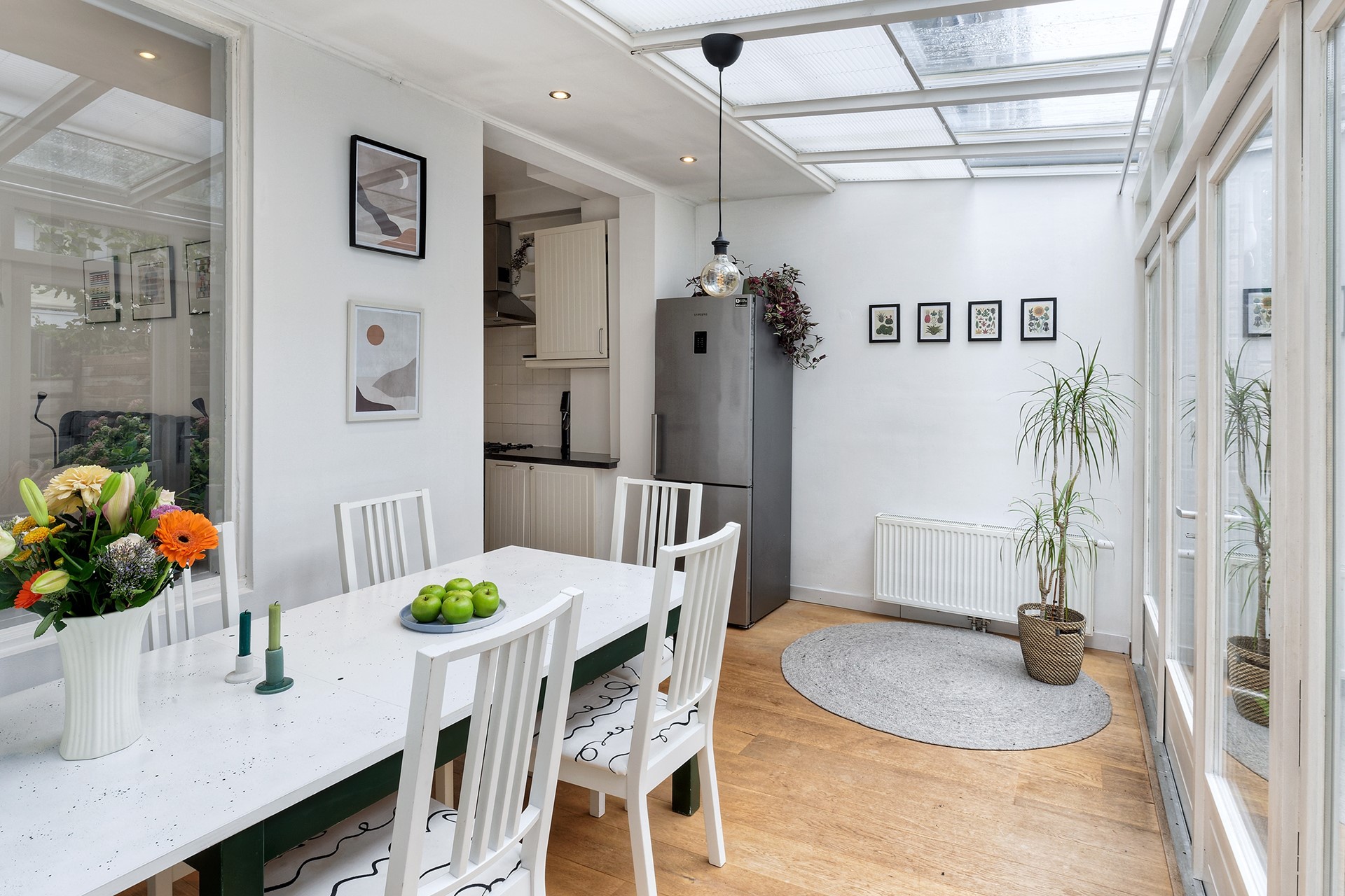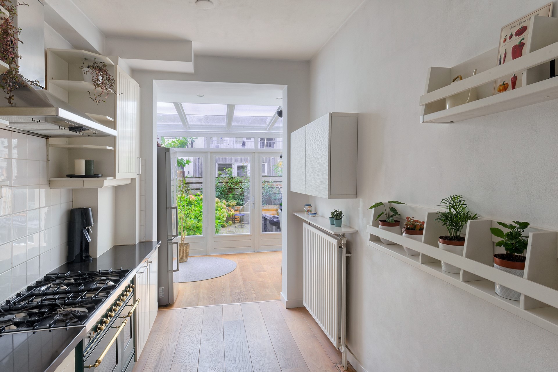 De keuken is uitgerust met hoogwaardige inbouwapparatuur, waaronder een robuust kooktoestel met dubbele ovens, en biedt veel kastruimte en een ruim werkblad. Aan de achterzijde zorgt de serre voor een prachtige lichtinval en een fijne verbinding met buiten. Via de openslaande deuren bereik je de zonnige tuin, ideaal voor lange zomeravonden.