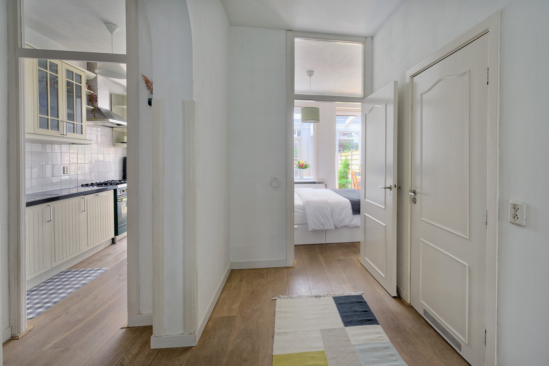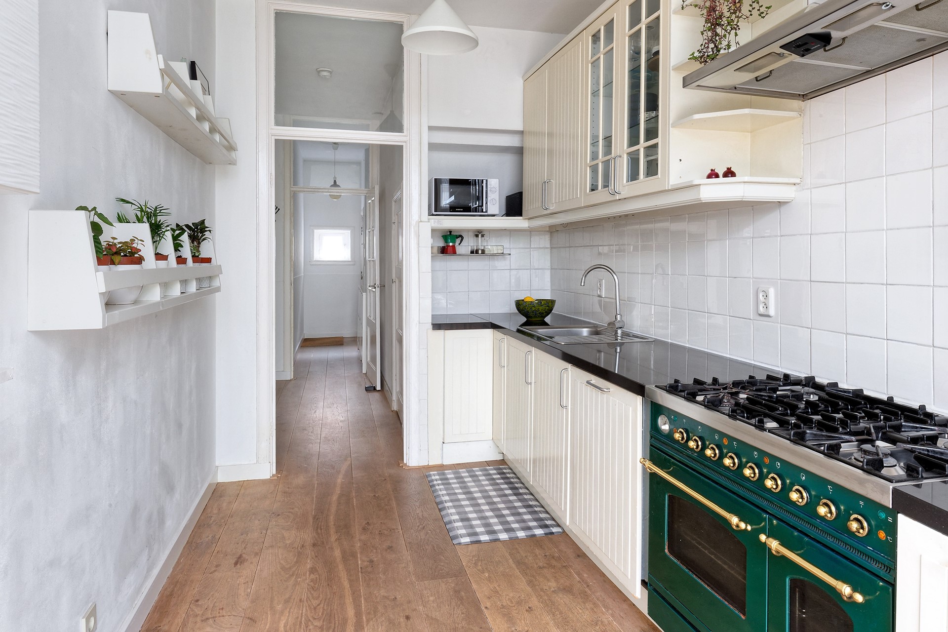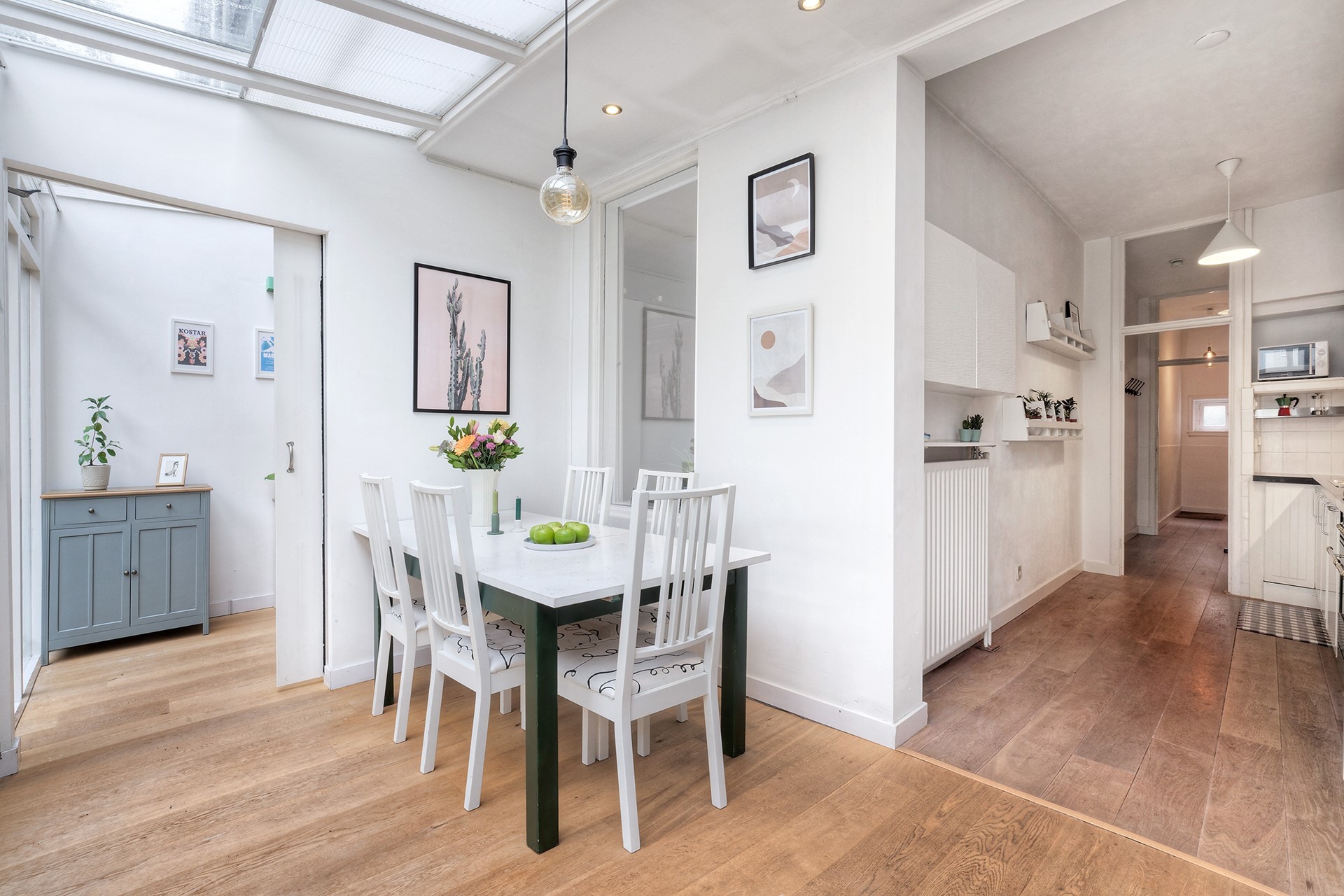 De keuken is uitgerust met hoogwaardige inbouwapparatuur, waaronder een robuust kooktoestel met dubbele ovens, en biedt veel kastruimte en een ruim werkblad. Aan de achterzijde zorgt de serre voor een prachtige lichtinval en een fijne verbinding met buiten. Via de openslaande deuren bereik je de zonnige tuin, ideaal voor lange zomeravonden.
