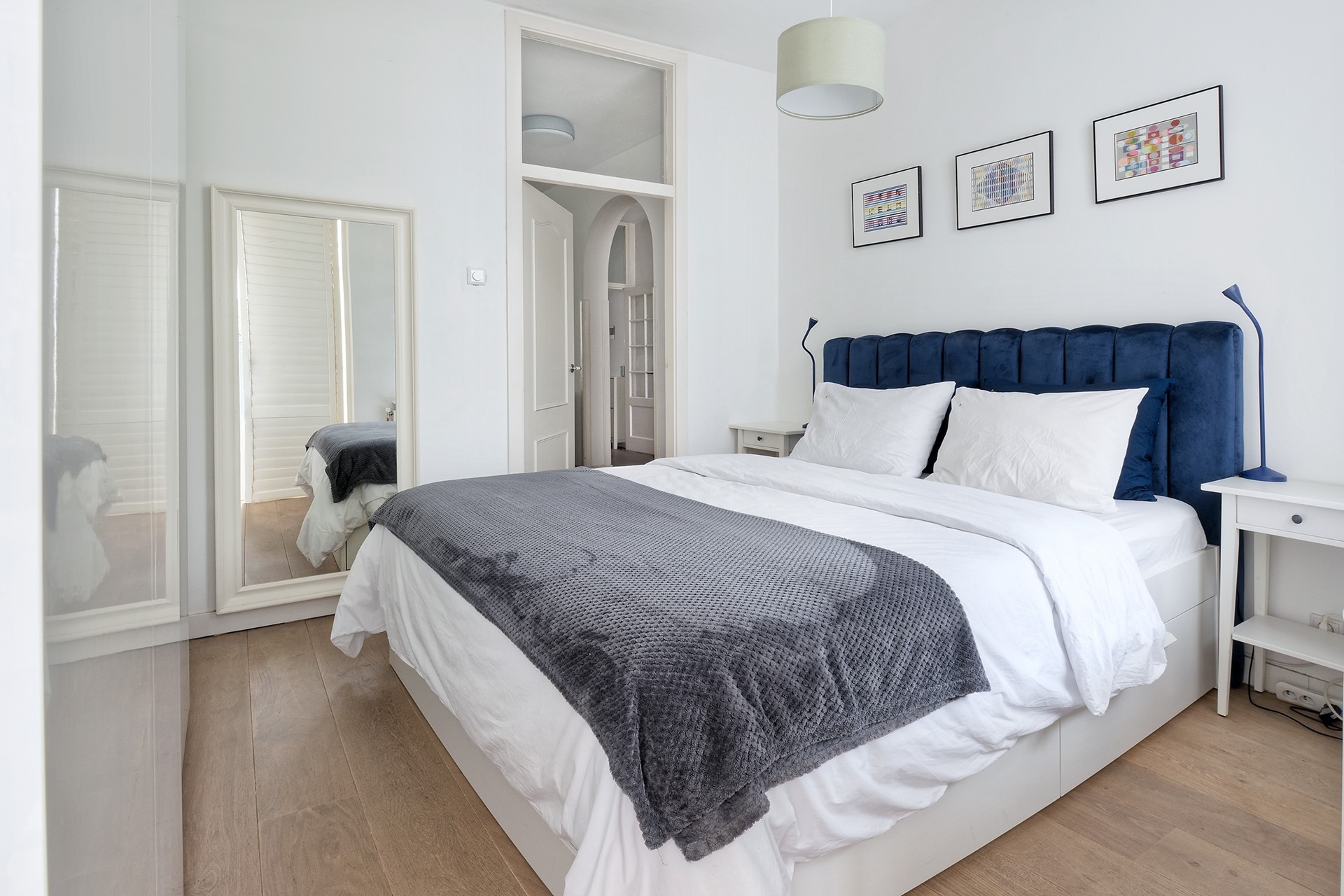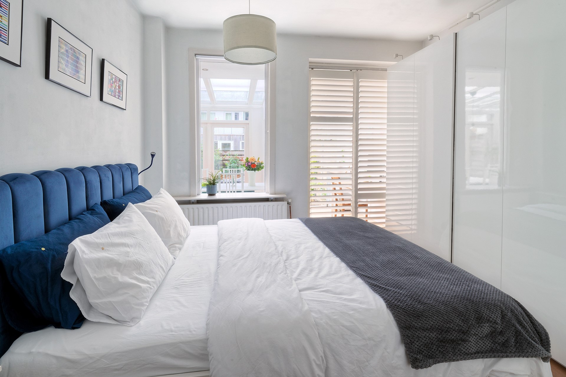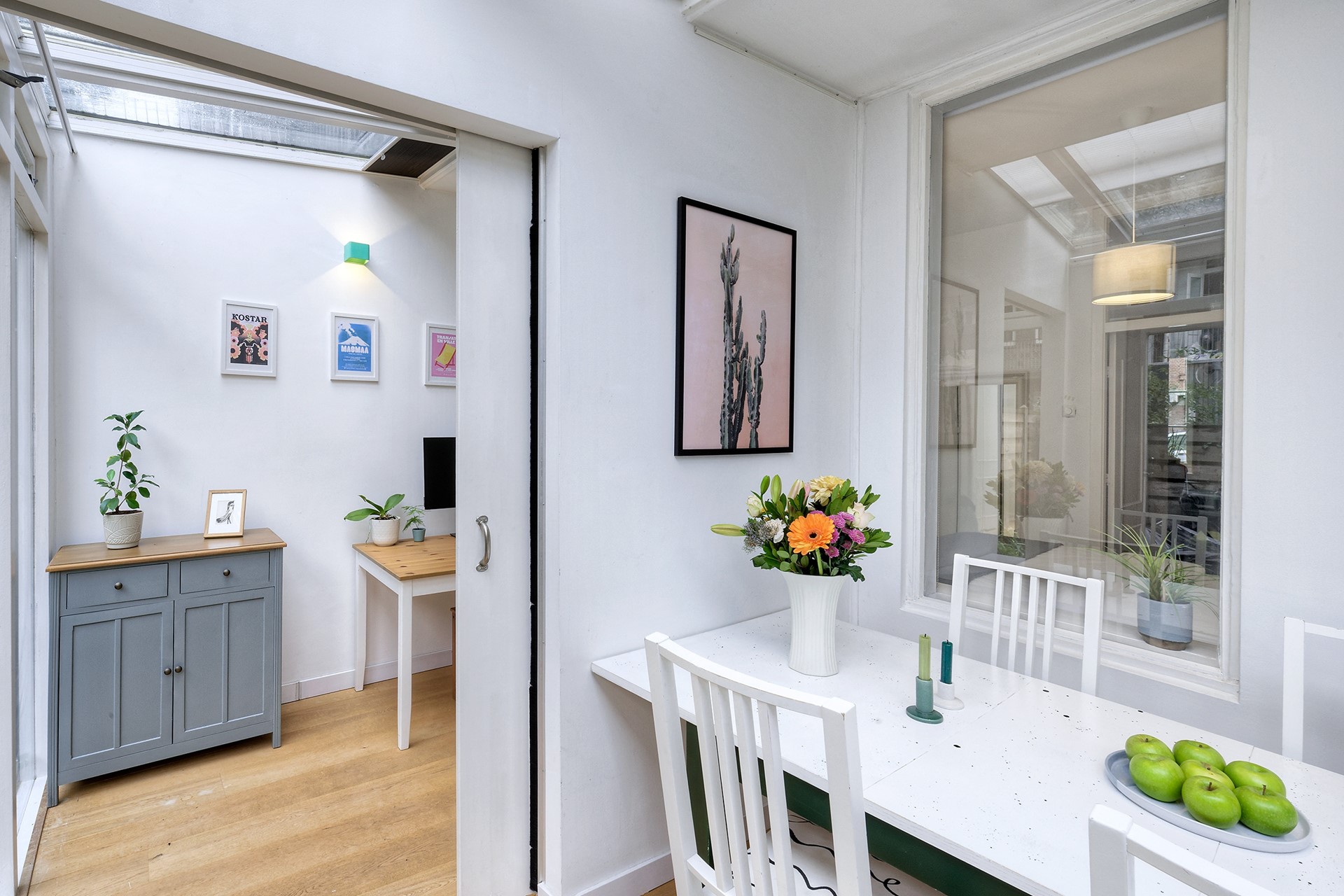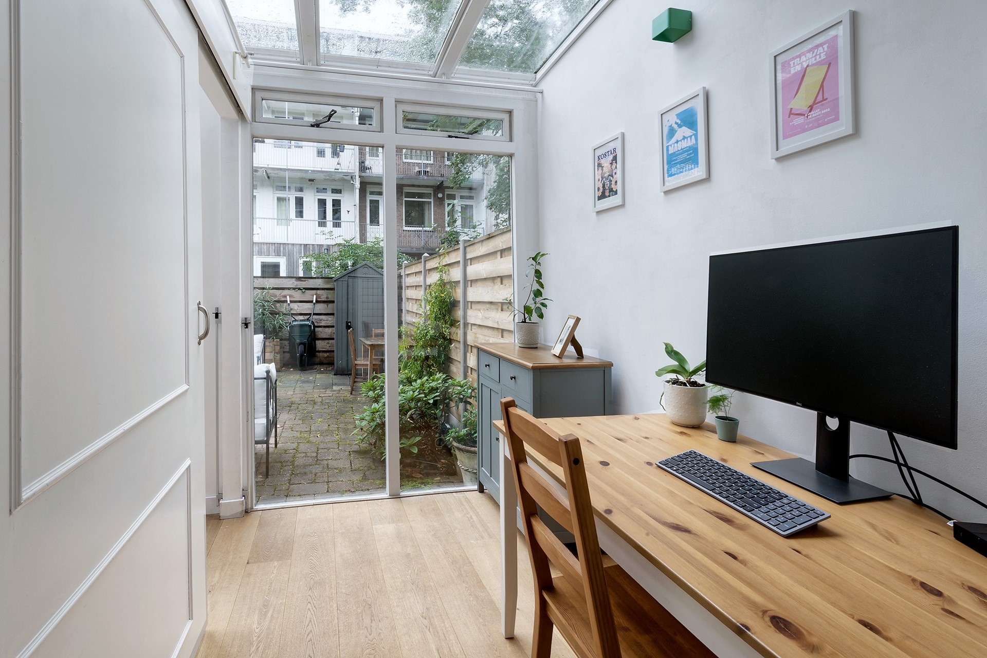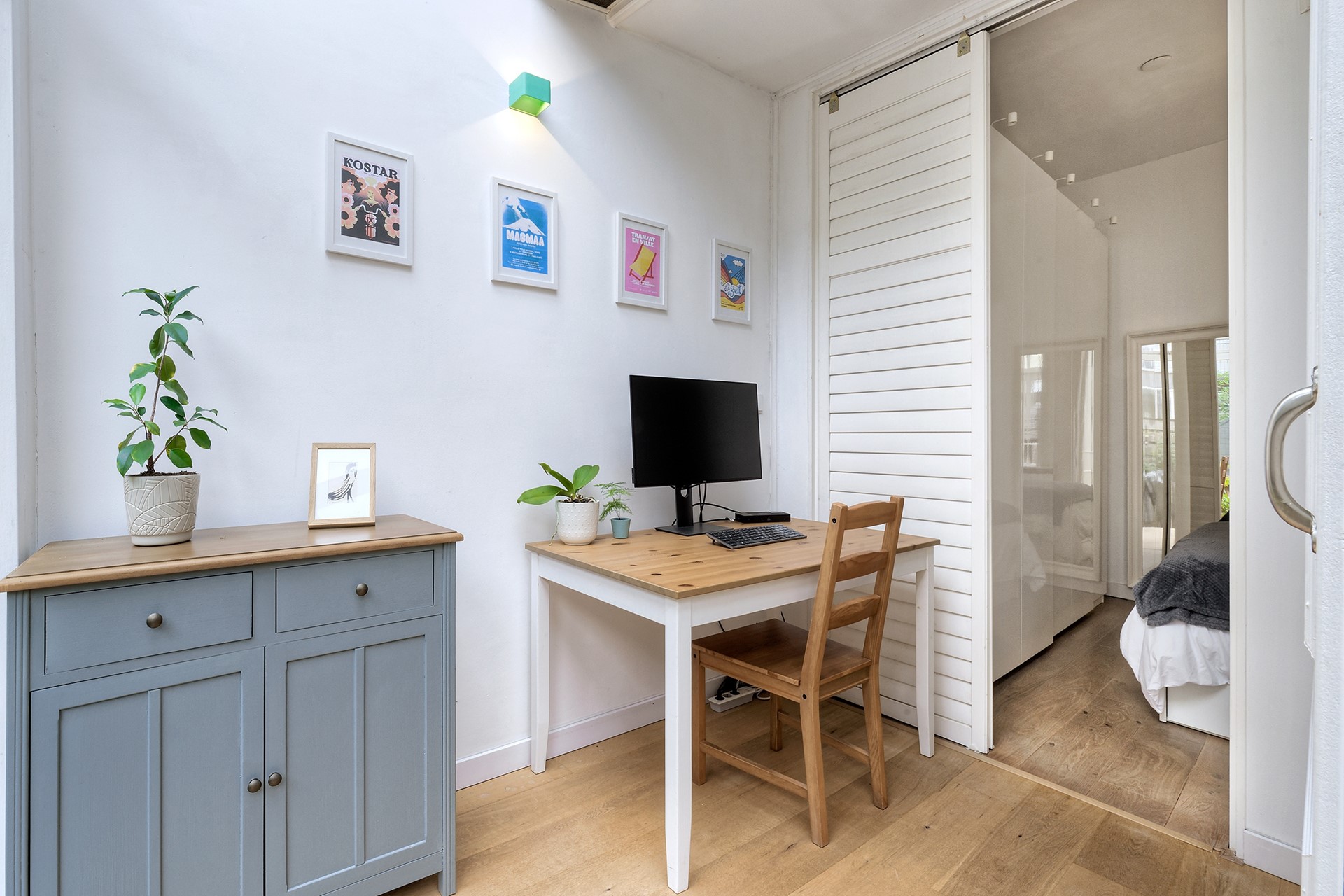 De woning beschikt over een ruime slaapkamer met kastenwand en prettig daglicht. Daarnaast is er in de serre een aparte werkruimte, die met een schuifdeur kan worden afgesloten – perfect voor wie thuis werkt. De moderne badkamer is voorzien van een inloopdouche, wastafelmeubel en toilet.