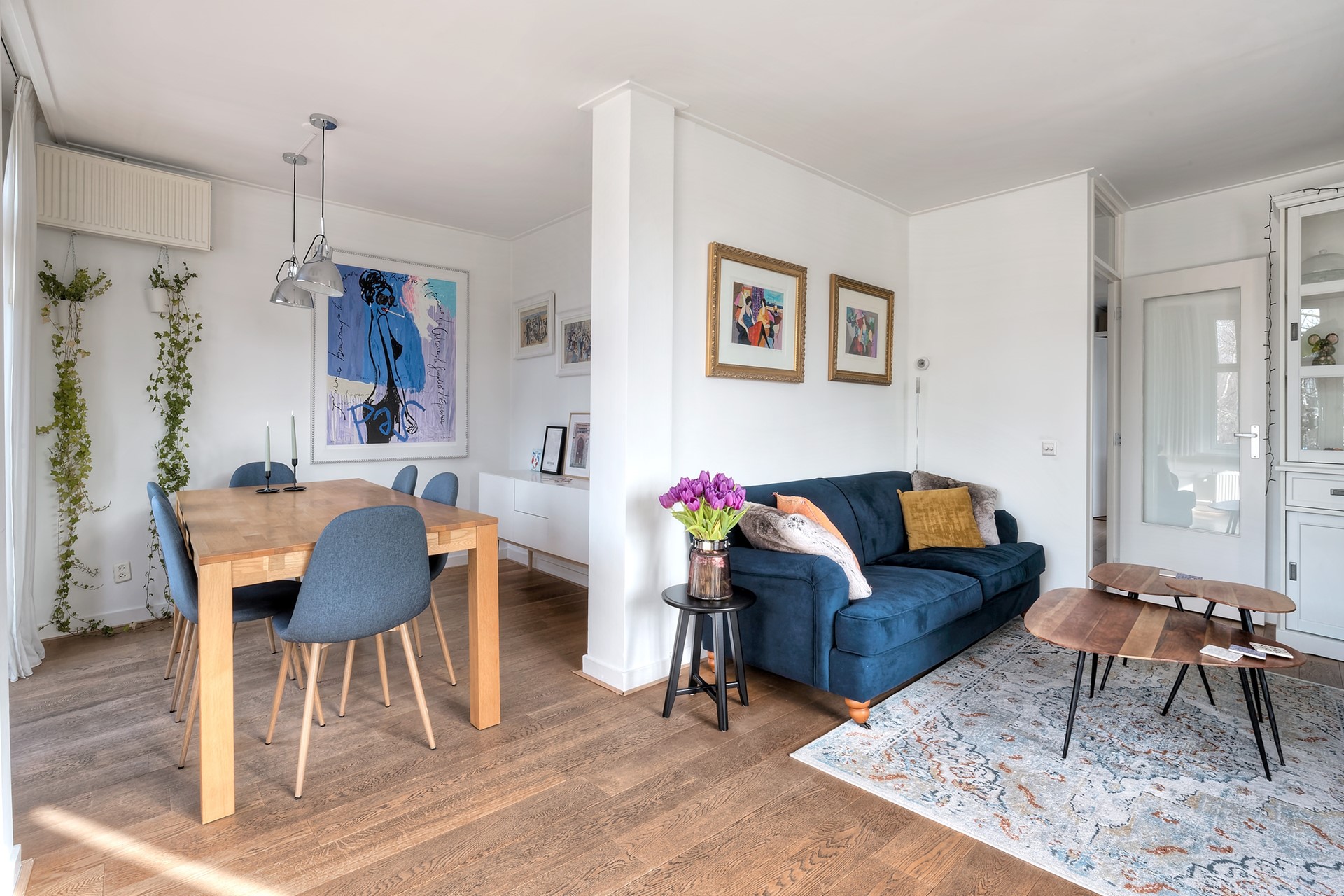 Je komt binnen via de hal, die toegang geeft tot de lichte woon- en eetkamer. Door de grote ramen en de hoekligging voelt dit echt als een fijne, open leefruimte. De erker en houten vloer geven het geheel net wat extra sfeer. Vanuit de woonkamer stap je zo het balkon op het westen op.