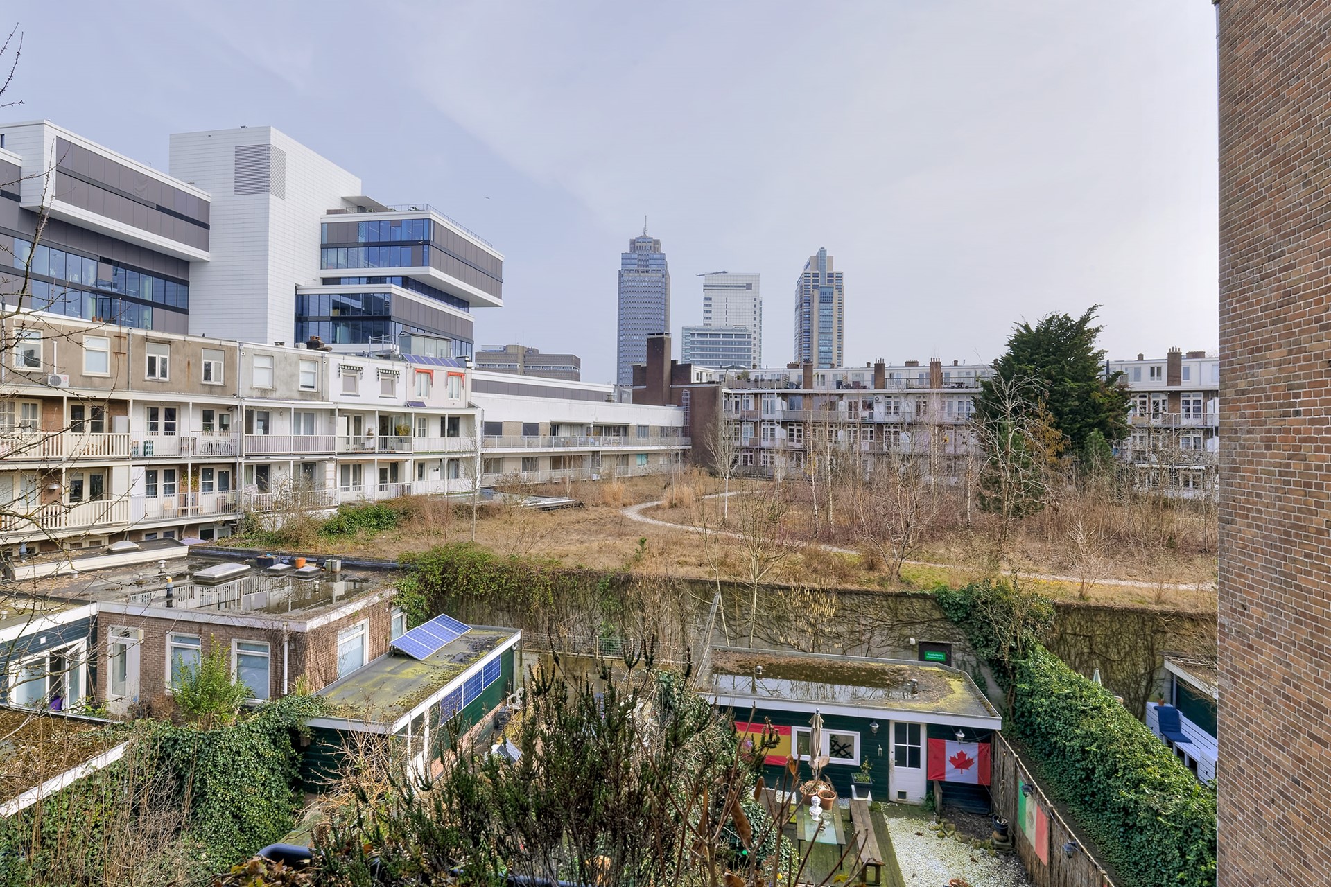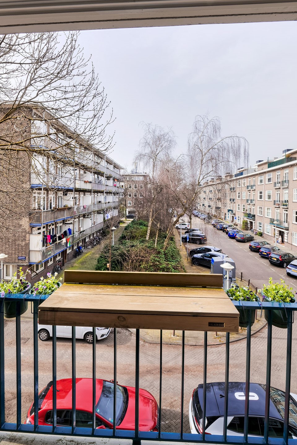 De slaapkamer aan de achterzijde is echt een pluspunt: openslaande deuren naar het balkon op het oosten, dus wakker worden met zon. Je kijkt hier uit op de binnentuin en in de verte zie je de skyline met de Rembrandttoren, Mondriaantoren en Breitnertoren.