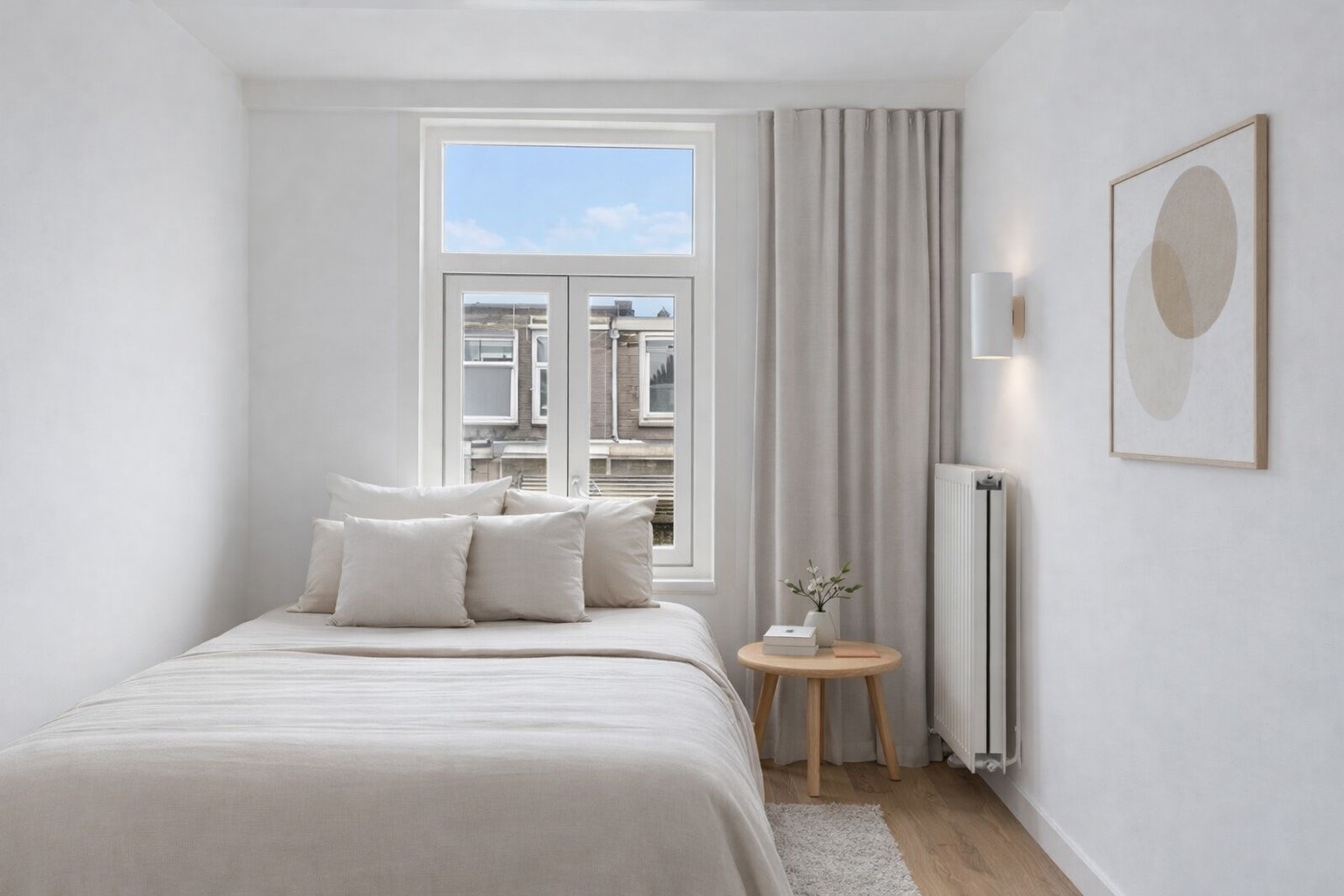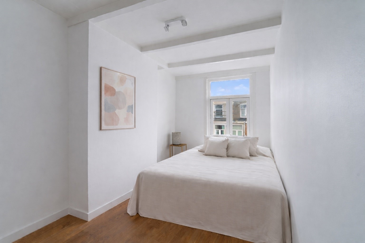 Vanaf de straat naar de tweede verdieping waar het appartement begint, de woonkamer bevindt zich op de derde verdieping waar zich ook de keuken, het balkon op het zuiden en een slaapkamer is. Deze slaapkamer kan ook uitstekend als werkkamer worden ingericht.