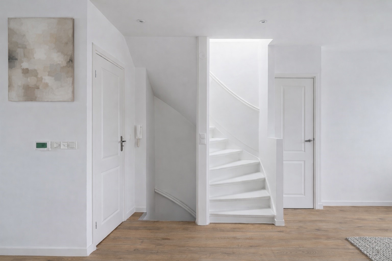 Met de open binnentrap naar de vierde verdieping waar nog drie slaapkamer en de badkamer zich bevinden.